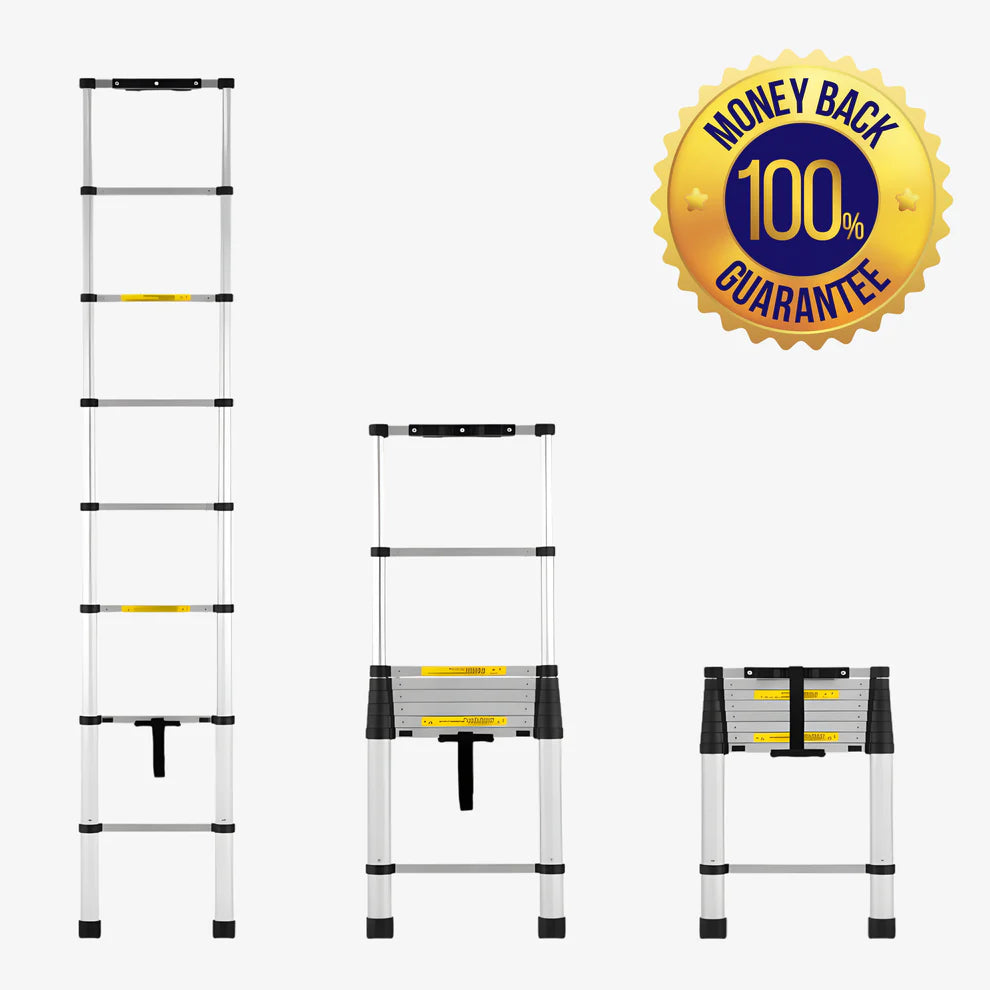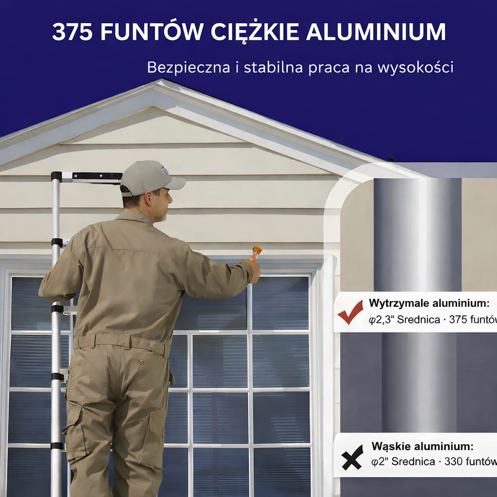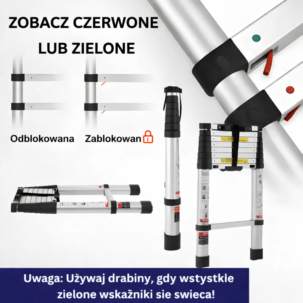 Każdy segment posiada niezawodne zatrzaski blokujące z widocznymi wskaźnikami, które zapewniają, że każdy stopień jest bezpiecznie zablokowany przed wejściem na drabinę. Możesz wchodzić z pełnym zaufaniem, wiedząc, że każdy stopień jest bezpieczny, stabilny i gotowy, aby Cię podtrzymać.