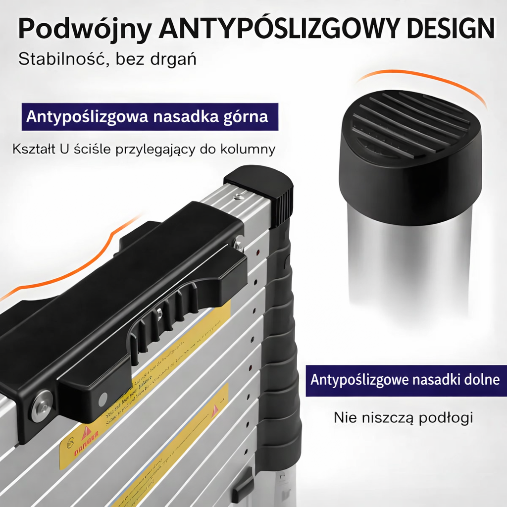 Aby zwiększyć bezpieczeństwo, wprowadziliśmy znaczące ulepszenia w materiale i konstrukcji połączeń stopni, dzięki czemu drabina będzie trwała przez wiele lat. Nie będziesz już musiał zmagać się z ciągłymi wymianami. Dzięki antypoślizgowej górnej osłonie oraz dolnym antypoślizgowym stopkom, drabina teleskopowa prawie nie drga podczas wchodzenia i stania na niej. Dodatkowo chroni ściany i podłogi przed zarysowaniami.